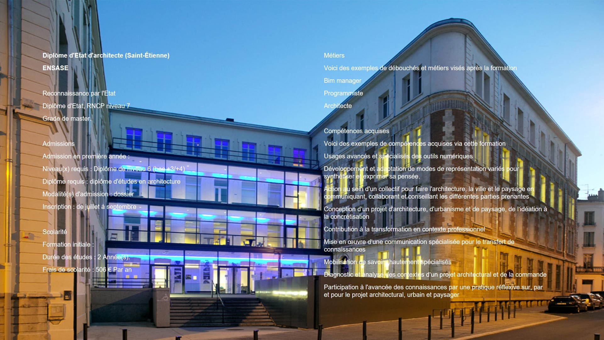 1기 과정 (학사, Licence): 3년 과정으로, 건축학의 기본 지식과 기술을 습득해요. 이 기간 동안 역사, 건축 이론, 조형 예술 등을 배우며 각 학기마다 프로젝트 수업을 진행합니다.