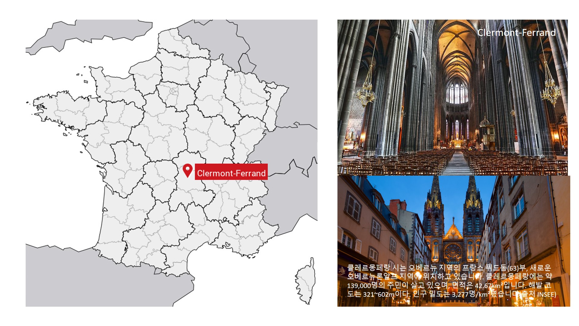 클레르몽 페랑 도시: 클레르몽 페랑은 역동적인 학생 도시로, 프랑스 중부에 위치하여 리옹, 파리 등 주요 도시로의 접근성이 좋습니다..