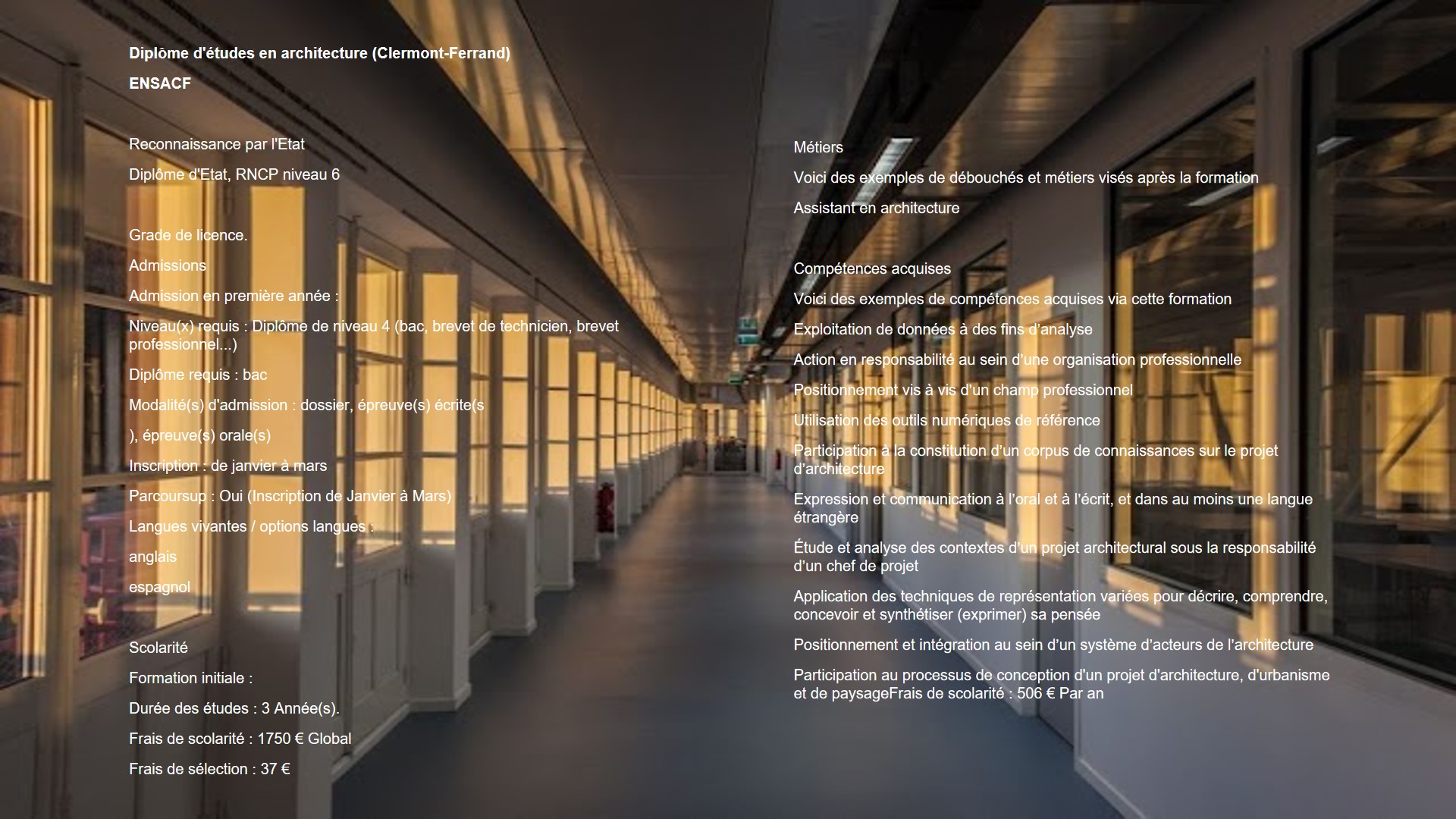 복수 학위: 클레르몽 페랑 건축학교는 클레르몽 폴리테크와 협력하여 건축-엔지니어 복수 학위 프로그램을 제공합니다. 이를 통해 학생들은 7년간의 과정을 거쳐 건축사 학위와 토목 공학 분야의 엔지니어 학위를 동시에 취득할 수 있습니다.