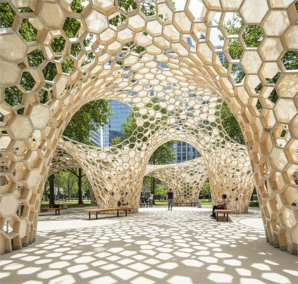 재료 및 제조: 종종 디지털 디자인 및 첨단 제조 기술(예: 컴퓨터 기반 절단, 모듈화된 조립)을 사용하여 복잡한 자연 형태를 구현하며, 지속 가능한 재료(목재, 재활용 플라스틱 등)를 사용하는 경우가 많습니다.