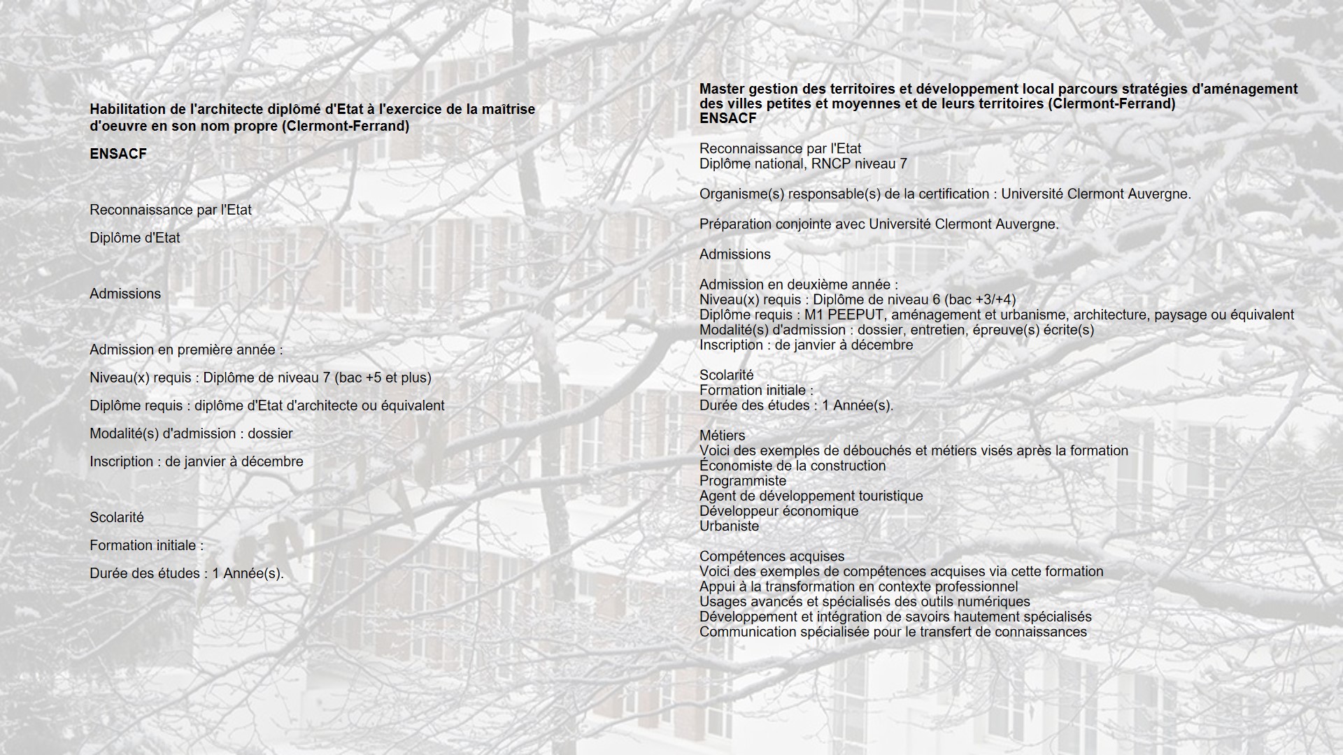 - Master STRATAM: 중소도시 및 영토 정비 전략에 특화된 석사 학위(Université Clermont Auvergne 협력).