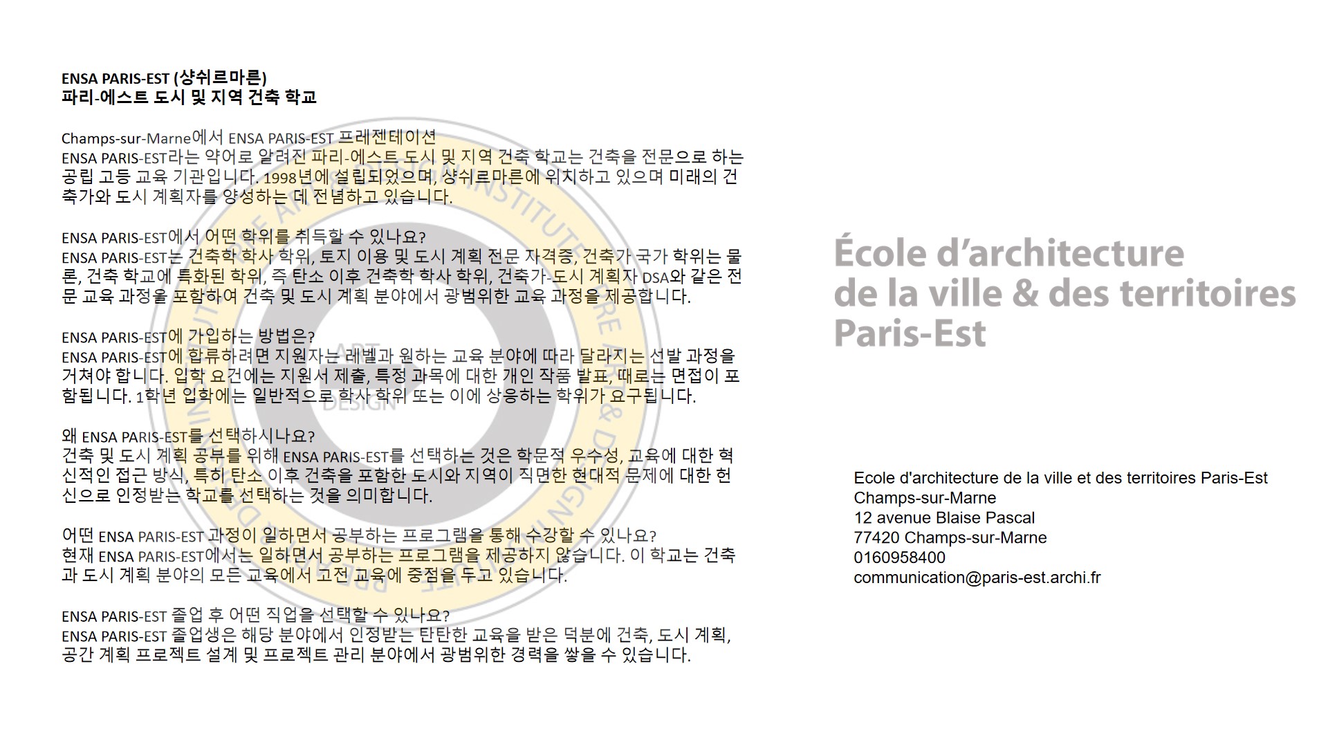 프랑스의 20개 국립건축학교(ENSA) 중 하나인 **파리 에스트 국립고등건축학교(ÉNSA Paris-Est)**에 대해 소개해 드립니다.