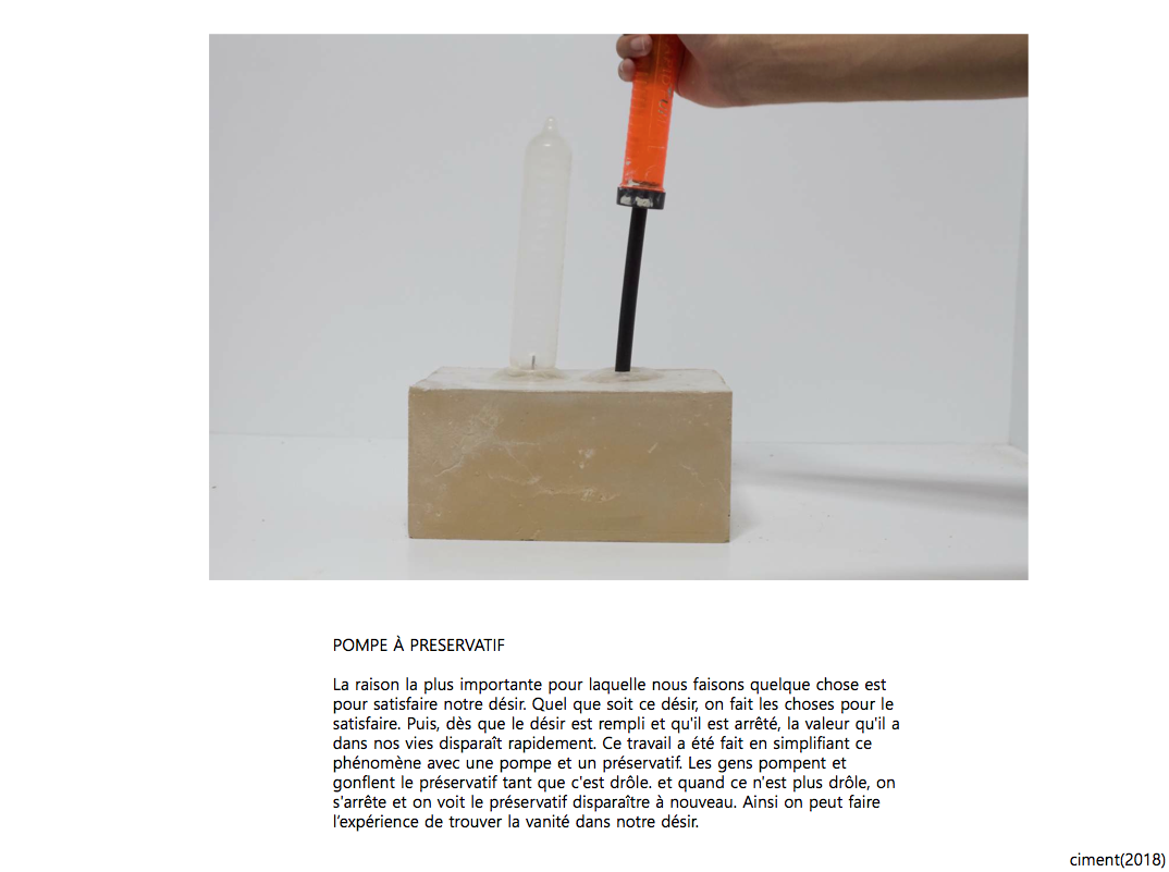 Ce projet est un dispositif interactif simple qui met en évidence le fonctionnement du désir humain à travers l’action de gonfler un préservatif à l’aide d’une pompe. Le spectateur, en injectant de l’air, éprouve une montée de tension et une satisfaction momentanée à mesure que la forme se développe ; cependant, dès que l’action s’arrête, l’objet se dégonfle et revient immédiatement à son état initial, révélant ainsi le paradoxe selon lequel l’accomplissement du désir entraîne sa propre disparition. Le projet montre ainsi que le plaisir et la valeur ne résident pas dans le résultat, mais dans le processus même de l’action, mettant en lumière la nature cyclique, éphémère et fondamentalement vaine du désir humain.