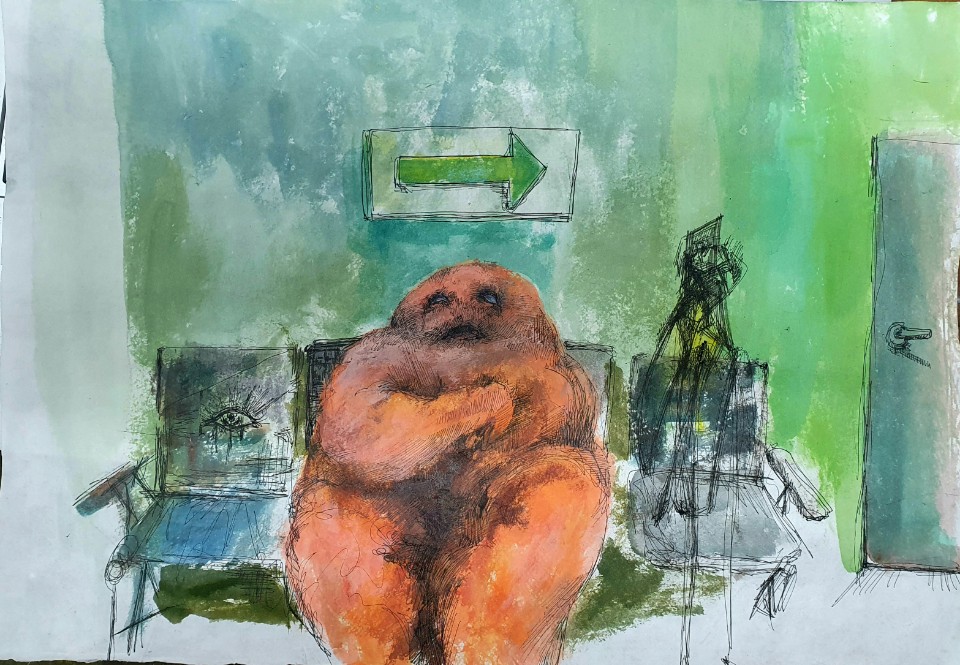 Ce travail met en lumière l’état psychologique de l’individu contemporain, où coexistent anxiété et sentiment d’impuissance. Au centre, une figure massive recroquevillée, au corps exagérément gonflé et au visage sans expression, symbolise une forme d’engourdissement émotionnel et d’auto-répression. Les figures environnantes, floues et déformées, suggèrent la rupture des relations et un profond sentiment d’isolement. Le fond mêlant des tons verts et bleutés crée une atmosphère froide et apathique, tandis que la flèche directionnelle en haut évoque à la fois la pression d’avancer et l’ironie d’une perte de repères. Dans son ensemble, l’œuvre exprime la condition d’un individu portant le poids des attentes sociales et de ses angoisses intérieures, se retrouvant progressivement déstabilisé et en perte de forme.